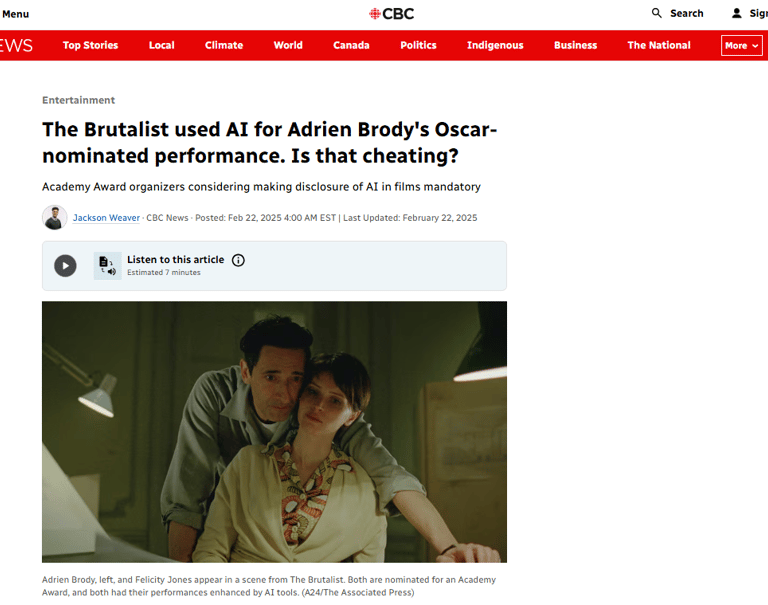 In February 2025, Mark was contacted by the Canadian Broadcasting Corporation following a conversation he'd had about the use of Artificial Intelligence in the film The Brutalist. This led to two features on CBC News, where he shared his perspective as a dialect coach on AI, performance, and authenticity.